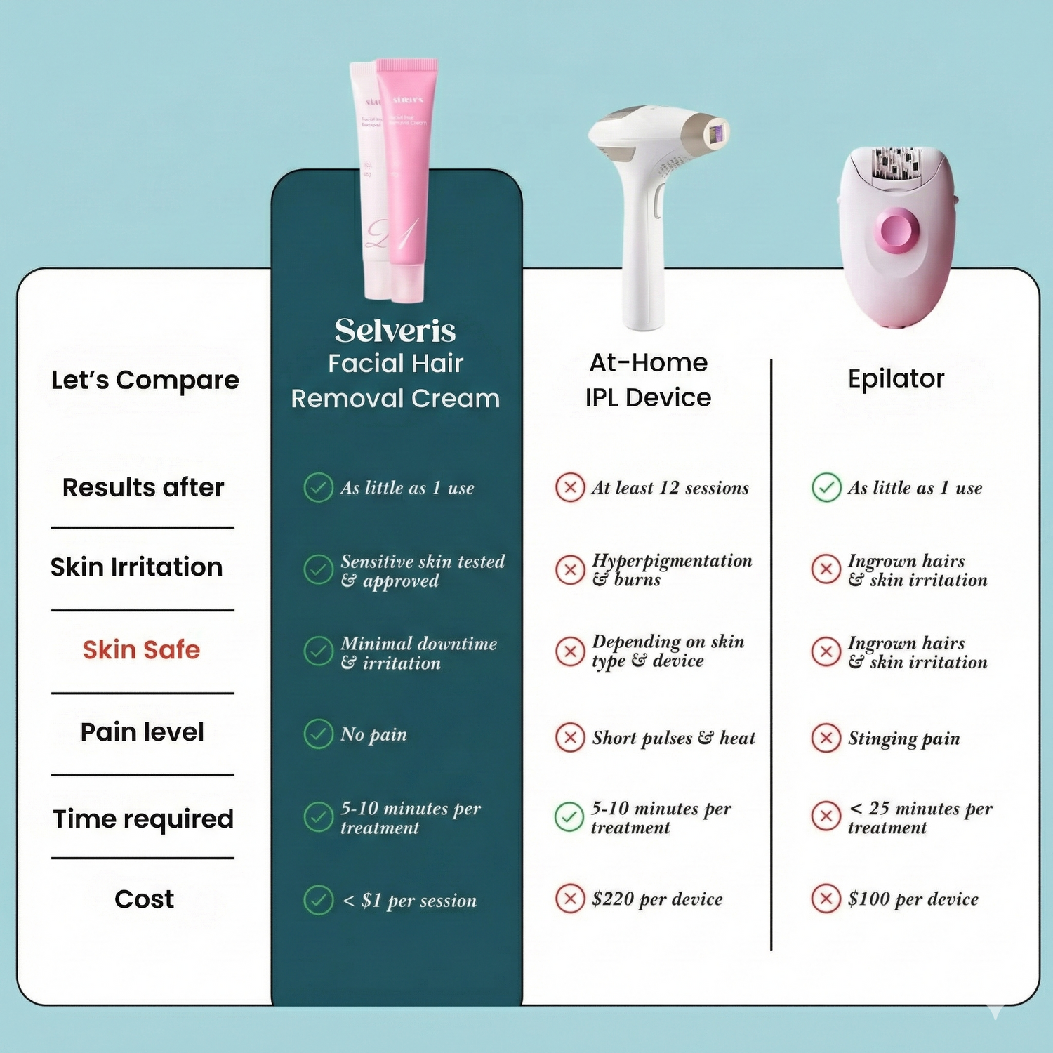 With extensive experience in women’s hormonal health and dermatology, Dr. Sharma recommends Selveris for patients dealing with PCOS and persistent facial hair. Its science backed formula targets hair at the surface while supporting clear, healthy skin, without the chemical burns or uneven results often caused by traditional depilatory products.